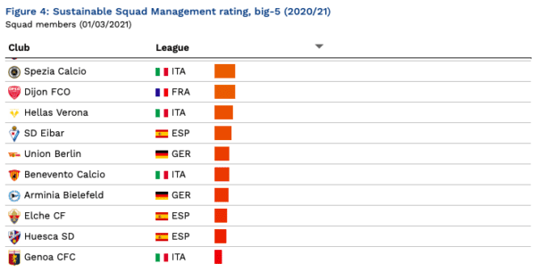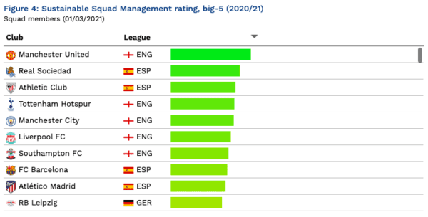 Emergono diverse politiche a lunga scadenza, ma non si può fare finta di nulla e non vedere che la prima italiana in questa statistica è 29esima ed è il Sassuolo, il che la dice lunga sulla competitività del nostro campionato rispetto agli altri. I calcoli restituiscono situazioni di maggiore progettualità prevalentemente nel campionato inglese (il Manchester United è in testa in questo dato) e spagnolo (le due basche Real Sociedad e Athletic Bilbao sul podio assieme ai Red Devils). Una sola tedesca, il RedBull Lipsia, al decimo posto a interrompere un predominio anglo-spagnolo.