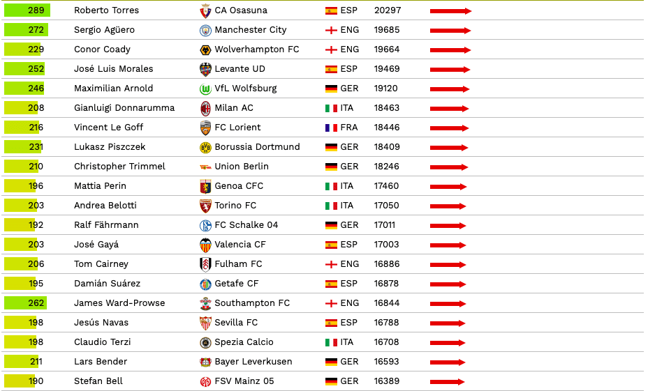 Sul dato numerico e statistico incide chiaramente molto il ruolo ricoperto, che si presta senza dubbio a minori avvicendamenti in corso di gara e di stagione rispetto a quanto non accada per un giocatore di movimento. Non a caso, in Italia, è all’ottavo posto per minuti giocati e nelle prime otto posizioni si trovano altri tre “colleghi: Donnarumma (7°), Cordaz (5°) e Handanovic (1°).
