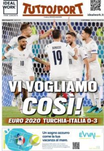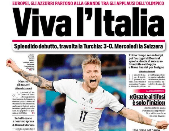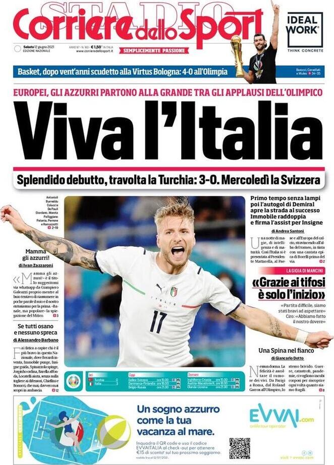 CORRIERE DELLO SPORT – Apre quest’oggi la prima pagina un “Viva l’Italia” per celebrare il convincente successo all’esordio della Nazionale del ct Mancini. “Splendido debutto, travolta la Turchia” prosegue il sottotitolo. All’interno del quotidiano, invece, si parla pochissimo di Genoa e il solo accostamento che viene fatto al club rossoblu è quello di Abdelhamid Sabiri, trequartista dell’Ascoli, per il quale si è scatenata una vera e propria asta con Fiorentina, Salernitana e Cagliari.