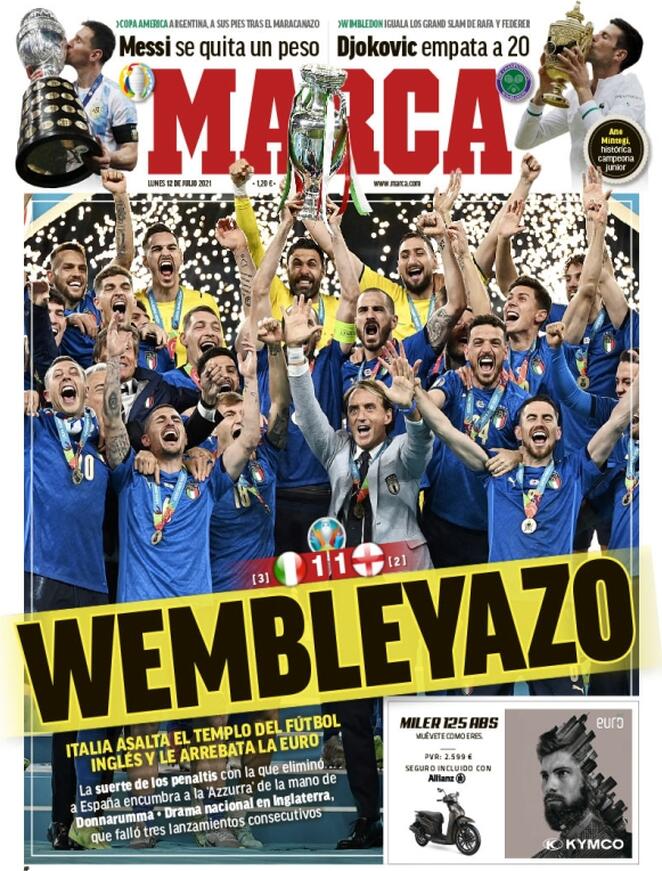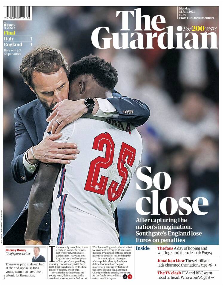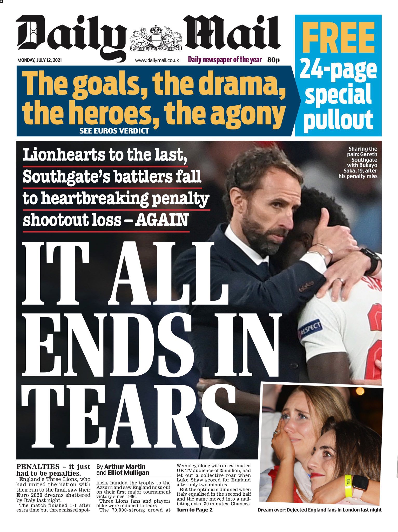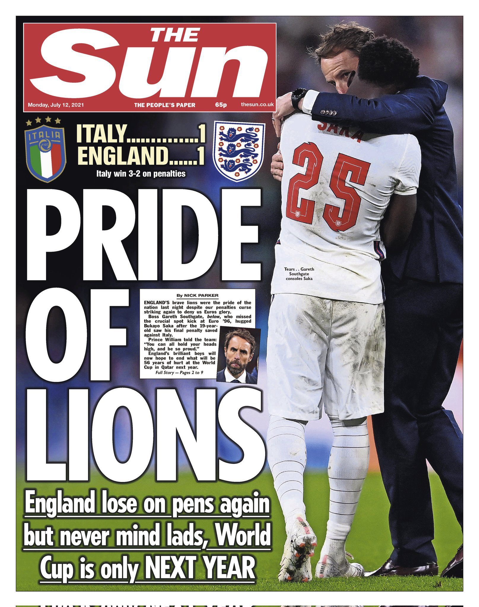 “L’Inghilterra perde di nuovo ai rigori ma non fa niente…i Mondiali sono il prossimo anno”. È questo il grido del Sun nel giorno dopo la sconfitta in finale della squadra di Southgate contro l’Italia di Mancini. La foto scelta quasi all’unanimità dai quotidiani d’oltremanica è l’abbraccio fra il commissario tecnico e Bukayo Saka. “Finisce tutto in lacrime” l’apertura del Daily Mail. “Wembleyazo” titola Marca, “Invincibili” è il lancio dell’Equipe.