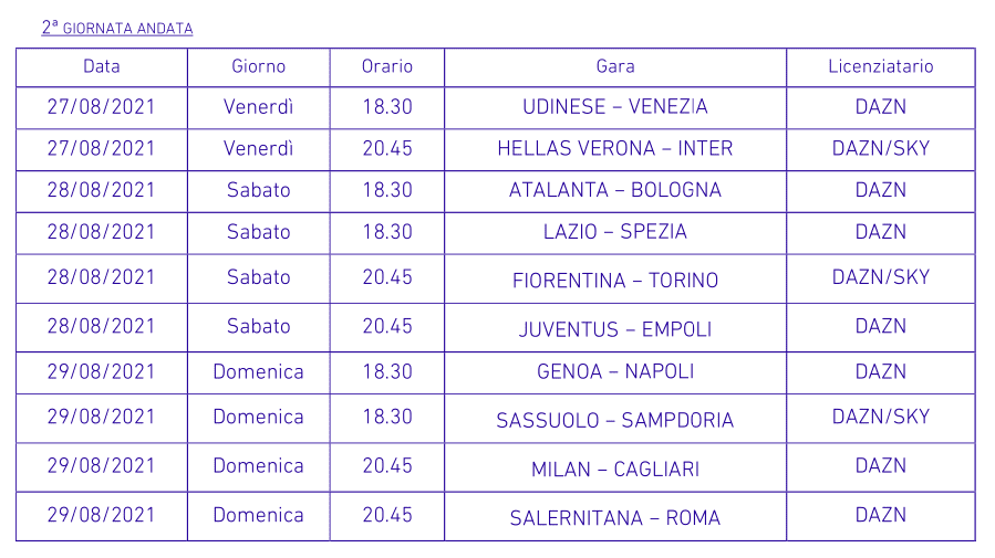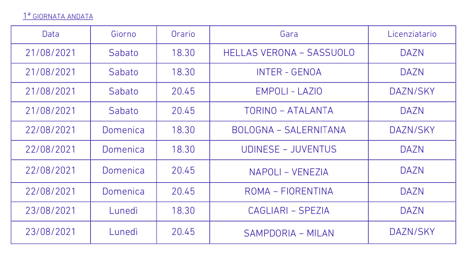 Sono stati comunicati anticipi e posticipi delle prime due giornate di Serie A. Il Genoa, assieme alla sfida tra Hellas Verona e Sassuolo, inaugurerà il prossimo campionato in casa dell’Inter. La gara verrà infatti trasmessa sabato 21 agosto (ore 18.30) dall’emittente DAZN. La prima gara al Ferraris, invece, sarà domenica 29 agosto (ore 18.30) contro il Napoli, nuovamente in onda su DAZN.