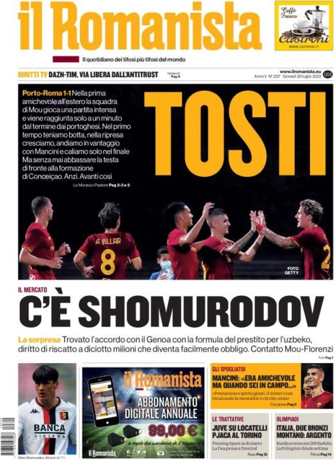 CORRIERE DELLO SPORT – Sorpresa Shomurodov: c’è l’accordo con il Grifone per il suo arrivo alla Roma. Già nelle prossime ore potrebbe arrivare l’annuncio ufficiale di un’operazione in prestito con diritto di riscatto sulla base di circa 20 milioni complessivi: 2 milioni il primo anno e 16 di diritto, che potrebbe diventare obbligo allo scattare di determinate condizioni legate alla stagione dell’attaccante. Attaccante che andrebbe a fare la spalla di Dzeko. In entrata, è ormai definito l’arrivo di Hernani mentre piace Sagnan della Real Sociedad.