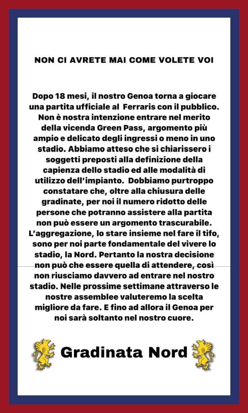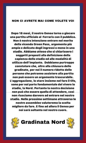 “Dopo 18 mesi, il nostro Genoa torna a giocare una partita ufficiale al Ferraris con il pubblico. Non è nostra intenzione entrare nel merito della vicenda Green Pass, argomento più ampio e delicato degli ingressi o meno in uno stadio. Abbiamo atteso che si chiarissero i soggetti preposti alla definizione della capienza dello stadio e alle modalità di utilizzo dell’impianto. Dobbiamo purtroppo constatare che, oltre alla chiusura delle gradinate, per noi il numero ridotto delle persone che potranno assistere alla partita non può essere un argomento trascurabile.