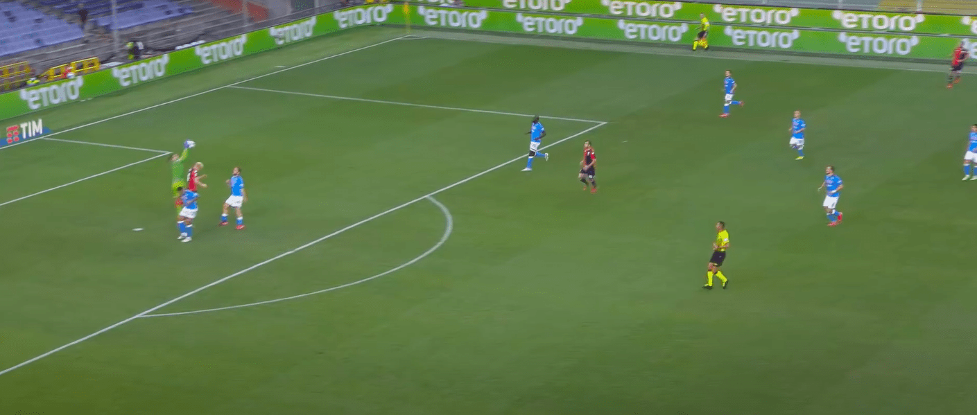 Prima ancora dell’episodio, che Di Bello avesse qualche problema di gestione lo si era captato dal giallo ad Ekuban dopo pochi minuti per un intervento interamente sul pallone. Prima dell’episodio Buksa-Meret, invece, era emersa una chiara prova di cosa significhi essere portieri sicuri (e da Nazionale). Sirigu pronto e attento su qualunque uscita, anche su quei palloni radenti che potevano apparire più pericolosi; in parallelo, Meret insicuro al punto da rischiare di farsi un clamoroso autogol un minuto prima di perdere il pallone consegnandolo a Pandev per la rete dell’uno a uno. Insomma, che il portiere partenopeo non stesse brillando in sicurezza era chiaro già prima dell’episodio VAR. Rivediamolo.