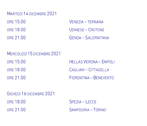 Sono state rese note dalla Lega Serie A date e orari per i sedicesimi di finale di Coppa Italia, in programma nel mese di dicembre. Genoa-Salernitana si giocherà il giorno 14 alle ore 21. Prossimamente sarà resa nota l’emittente che trasmetterà la partita fra rossoblu e granata.