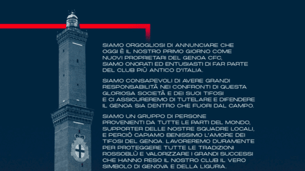 Una breve lettera, con la Lanterna di Genova sullo sfondo circondata dallo scudetto del Genoa. Il tutto circondate da tinte e sfumature rossoblu, con poche parole dirette ai tifosi del Genoa. Si presenta così, attraverso i social, la prima lettera dei nuovi proprietari del Genoa indirizzata ai supporter rossoblu.