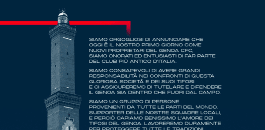 Una breve lettera, con la Lanterna di Genova sullo sfondo circondata dallo scudetto del Genoa. Il tutto circondate da tinte e sfumature rossoblu, con poche parole dirette ai tifosi del Genoa. Si presenta così, attraverso i social, la prima lettera dei nuovi proprietari del Genoa indirizzata ai supporter rossoblu. “Siamo orgogliosi di annunciare che oggi … Leggi tutto Lettera ai Genoani dei nuovi proprietari. “Non vediamo l’ora di raggiungere assieme traguardi sempre più ambiziosi”