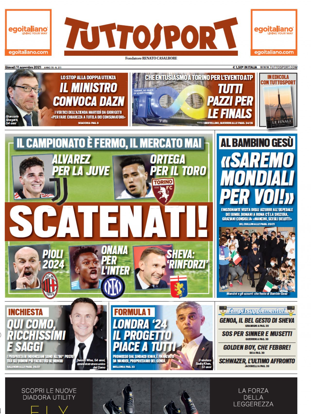 TUTTOSPORT – Del possibile nuovo GP londinese parla anche il quotidiano torinese: “Progetto promosso dal sindaco Khan, è finanziato da Wander, proprietario del Genoa” si legge in prima pagina. “Ti salverò” è la frase di Shevchenko scelta come introduzione, prima di soffermarsi sulla nuova proprietà: “Mi hanno garantito rinforzi importanti” ha sottolineato l’ucraino. Capitolo calciomercato: possibile il ritorno di Tomas Rincon, giocatore per il quale sono già state chieste informazioni al Torino di Juric. “E bravo Sheva, ora però diamogli tempo” è la conclusione del pezzo dedicato alla conferenza stampa.