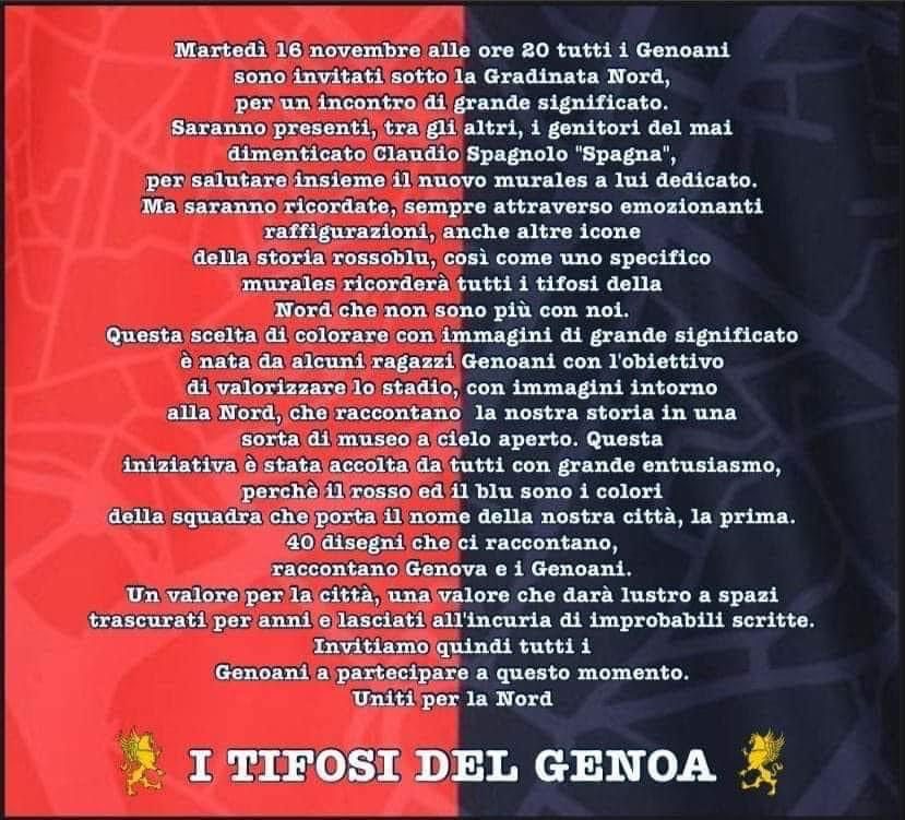“Martedì 16 Novembre alle ore 20 tutti i Genoani sono invitati sotto la Gradinata Nord per un incontro di grande significato. Saranno presenti, tra gli altri, i genitori del mai dimenticato Claudio Spagnolo “Spagna” per salutare insieme il nuovo murales a lui dedicato. Ma saranno ricordate, sempre attraverso emozionanti raffigurazioni, anche altre icone della storia rossoblu, così come uno specifico murales ricorderà tutti i tifosi della Nord che non sono più con noi.