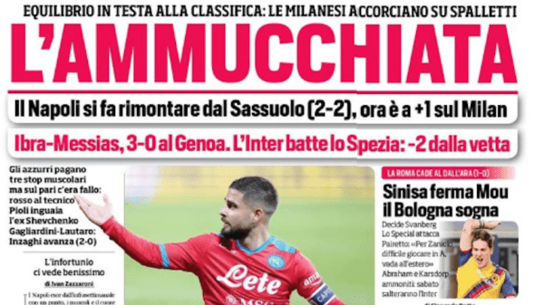 REPUBBLICA GENOVA – Una squadra “fragile” si consegna al potere dell’avversario, restando virtualmente retrocessa e senza aver mai vinto in casa. “Alberto Zangrillo dice che quello del Genoa è uno straordinario progetto a medio e lungo termine – si legge in apertura – Ma il presidente e 777 Partners faranno bene a preoccuparsi subito anche del presente”. E ancora: “Ma come può Shevchenko cambiare il destino di una banda perdente?”. Non potrebbe riuscirci neanche il già citato Zangrillo, luminare di rianimazione, se non saccheggiando il mercato di gennaio. I rossoneri non hanno dato l’impressione di essere una squadra “mondiale”. Si sono mossi bene e gli è bastato: “è proprio il Genoa che è scarso”. Peccato mortale sul primo gol, grande parata di Maignan su Hernani. A fine partita la Nord continua a tifare nonostante tutto: “hanno vinto loro” la sintesi del quotidiano.