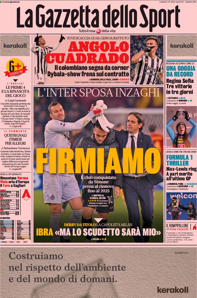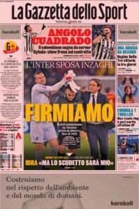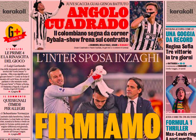 GAZZETTA DELLO SPORT – Il quotidiano in rosa parla di una “Juve che risale dall’angolo” e gioca sul fatto che la prima rete bianconera sia arrivata direttamente dalla bandierina. “Allegri domina, Sheva non si vede” prosegue la Gazzetta dello Sport, evidenziando la pochezza di questo Genoa falcidiato dalle assenze, “che non ha mai visto la faccia di Szczesny“, “arrendevole” e in grado di fare “errori a ripetizione in difesa, senza Rovella non riesce un’uscita palla al piede, e gli assenti non sono sostituibili“. Un’analisi dura, quella della rosea, che diventa impietosa al momento di guardare le statistiche sommate nelle prime due pagine del quotidiano. Si prosegue con le pagelle, che di fatto premiano solo Sirigu. A Shevchenko col suo “desolante zero” alla voce gol segnati rimane l’amarezza: “gli infortuni ci penalizzano, ma c’è tempo“.