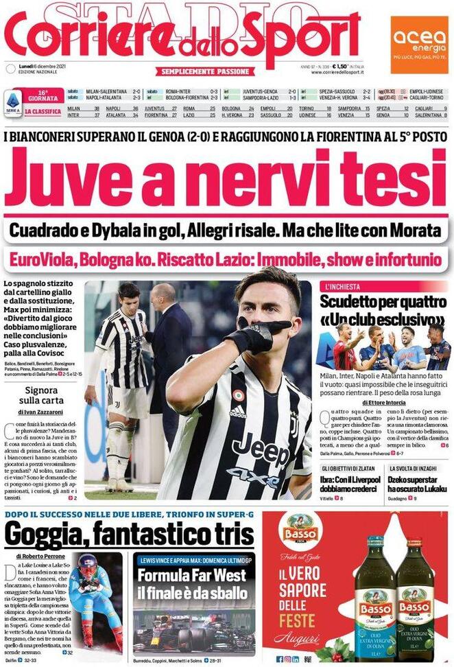CORRIERE DELLO SPORT – “Juve, perle e tensione“. Così titola il Corriere dello Sport nell’inquadrare con un titolo la sfida dell’Allianz, dove la formazione bianconera crea tanto, spreca molto e trova un Sirigu capace di evitare al Genoa un passivo più pesante (clicca QUI per leggere le sue dichiarazioni post partita). Nel complesso, però, gara che ha visto un Grifone mai pericoloso. “Contro un Genoa decimato e pressoché assente bastano le due giocate di Cuadrado e Dybala” sintetizza il sottotitolo del quotidiano, che poi analizza passo per passo la sfida. Non troppo bene, secondo il CorSport, l’operato di Chiffi, reo di aver perduto il metro giudizio nell’attribuzione dei cartellini. Il voto è cinque.