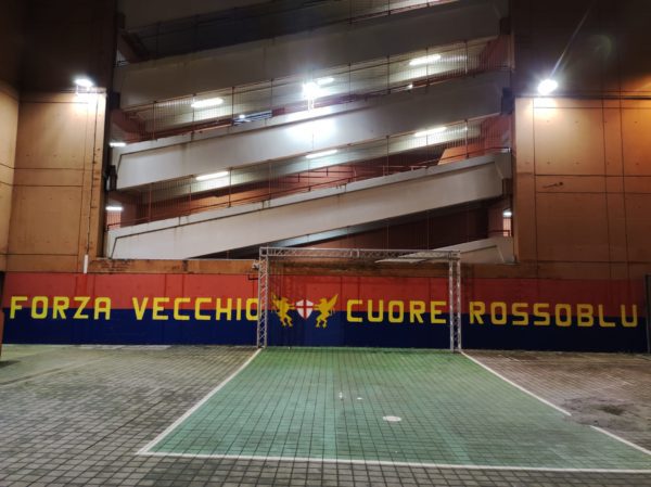 Il lavoro è giunto a termine oggi con l’ultima scritta, un “Forza Vecchio Cuore Rossoblu“, comparsa sul lato della Nord che fa angolo con le Tribune. Davanti a questo grido, che è un presidio di genoanità e lo potrà essere per lunghissimo tempo, è comparso il perimetro di un campetto da calcio sagomato sull’asfalto.
