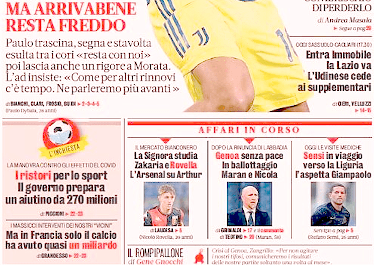 TUTTOSPORT – Maran sfida Gattuso (si è fatto un tentativo, ma è dura) per la panchina dopo il “no” di Labbadia. Un brutto colpo per l’ambiente, che a pochi giorni dalla partita contro l’Udinese si trova ancora senza un tecnico ufficiale. Si legge poi anche il nome di Nicola, per il quale alcuni tifosi hanno divulgato una petizione via social. Sicura l’assenza di Rovella contro l’Udinese. Capitolo calciomercato: Verdi nel mirino anche dei rossoblu, superati proprio dai granata per Pellegri. Prosegue il pressing per Miranchuk e Piccoli. “Il Genoa, sull’orlo del baratro, si dibatte in una crisi che ha origini lontane”. Si fa poi riferimento ad acquisti bravi ma poco esperti, definendo “surreale” la vicenda legata all’allenatore tedesco, che “dimostra la confusione nella cabina di regia”. Spors “arriva da una realtà diversa dalla nostra e sta cercando di capire che cosa serva al Genoa per salvarsi”.