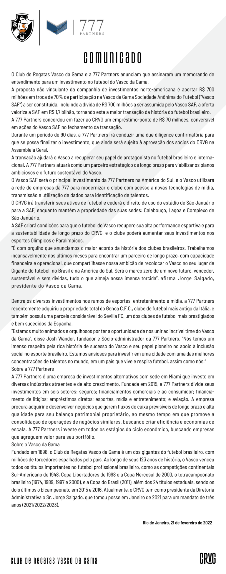 “L’operazione aiuterà il Vasco a riconquistare il suo ruolo di primo piano nel calcio brasiliano e internazionale. 777 Partners fungerà da partner strategico a lungo termine per consentire i piani ambiziosi e il futuro sostenibile di Vasco. Vasco SAF sarà il principale investimento di 777 Partners in Sud America e Vasco utilizzerà la rete di società di 777 per modernizzare il club con l’accesso alle nuove tecnologie multimediali, alla trasmissione e all’utilizzo dei dati per l’identificazione dei talenti. CRVG trasferirà le sue attività calcistiche e cederà il diritto di utilizzare lo stadio São Januário a SAF, pur mantenendo la proprietà delle sue sedi: Calabouço, Lagoa e Complexo de São Januário. SAF creerà le condizioni affinché il calcio di Vasco recuperi le sue elevate prestazioni sportive e per la sostenibilità a lungo termine del CRVG, e il club potrà aumentare i suoi investimenti negli sport olimpici e paralimpici”.