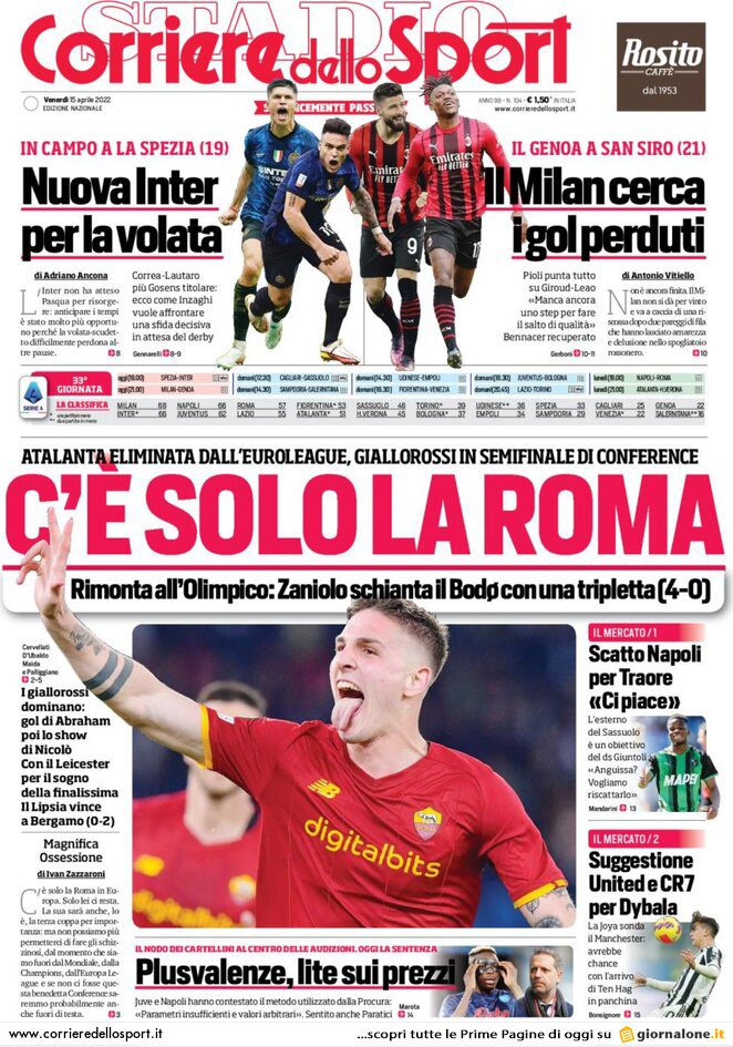 GAZZETTA DELLO SPORT – Il quotidiano in rosa parla ancora diffusamente del Milan, della necessità di tornare al gol per la formazione rossonera per rimanere in piena corsa fino alla fine nella lotta Scudetto. Il Genoa, dal canto suo, ha le stesse motivazioni per combattere fino all’ultimo in chiave salvezza. “Ritroviamo la giusta intensità” sono state le parole di Blessin alla vigilia. Sul fronte formazioni, Galdames dovrebbe andare a sostituire Sturaro in mezzo al campo, mentre Gudmundsson potrebbe partire largo a destra. Piccolo off-topic di mercato: Vasquez sarebbe finito nel mirino della Lazio laddove non andasse in porto la trattativa per Romagnoli dal Milan.