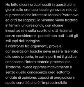 “Ho letto alcuni articoli usciti in questi ultimi giorni sulla cronaca locale genovese relativi al processo che interessa Manolo Portanova ed altri tre ragazzi; la vicenda viene trattata in termini unidirezionali, con alcune inesattezze e sulla scorta di atti risalenti, senza considerare – perché non noti – tutti gli sviluppi dell’indagine. Il confronto fra argomenti, prove e considerazioni logiche deve essere riservato alla sede propria, in cui le parti ed il giudice conoscono l’intera materia processuale.