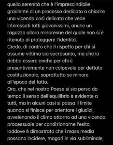 Trattarne invece approssimativamente e senza quella conoscenza crea soltanto ondate di opinione, capaci di pregiudicare quella serenità che è l’imprescindibile gradiente di un processo dedicato a chiarire una vicenda così delicata che vede interessati tutti giovanissimi, anche un ragazzo allora minorenne del quale non si è ritenuto di proteggere l’identità.