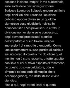 Scriveva Leonardo Sciascia ancora sul finire degli anni “80 che «quando l’opinione pubblica appare divisa su un qualche clamoroso caso giudiziario – divisa in “innocentisti” e “colpevolisti” – in effetti la divisione non avviene sulla conoscenza degli elementi processuali a carico dell’imputato o a suo favore, ma per impressioni di simpatia o antipatia. Come uno scommettere su una partita di calcio o su una corsa di cavalli» ma da allora quel monito non è stato raccolto, a tutto scapito non solo di chi si trova esposto al fenomeno (in questo caso un calciatore, con le simpatie od antipatie di maglia che o accompagnano), ma della stessa civiltà giuridica.