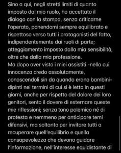 Sino a qui, negli stretti limiti di quanto imposto dal mio ruolo, ho accettato il dialogo con la stampa, senza criticarne l’operato, ponendomi sempre equilibrato e rispettoso verso tutti i protagonisti del fatto, indipendentemente dai ruoli di parte; atteggiamento imposto dalla mia sensibilità, oltre che dalla mia professione. Ma dopo aver visto i miei assistiti – nella cui innocenza credo assolutamente, conoscendoli sin da quando erano bambini – dipinti nei termini di cui si è letto in questi giorni, anche per rispetto del dolore dei loro genitori, sento il dovere di esternare queste mie riflessioni; senza tono polemico né di protesta e nemmeno per anticipare temi difensivi, ma soltanto per invitare tutti a recuperare quell’equilibrio e quella consapevolezza che devono guidare l’informazione, nell’interesse equidistante di tutte le parti coinvolte nel processo, oltre che del Giudice che dovrà scrivere la sentenza“.