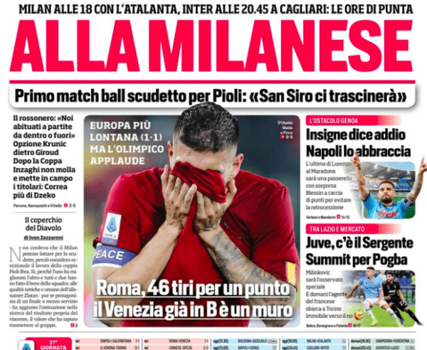 CORRIERE DELLO SPORT – “Lorenzo, baciala ancora” è il titolo col quale il Corriere dello Sport anticipa la sfida di questo pomeriggio (ore 15) tra Napoli e Genoa. Sarà “una marea di emozioni” per l’attaccante partenopeo Insigne, che da luglio volerà in Canada per iniziare la sua nuova avventura in MLS. Per affrontare uno stadio gremito e superare con punti in saccoccia l’ostacolo Maradona, il tecnico rossoblu Blessin è chiaro: “Il Genoa deve superare i suoi limiti“. Saranno previsti 1200 tifosi rossoblu al fianco del Grifone.