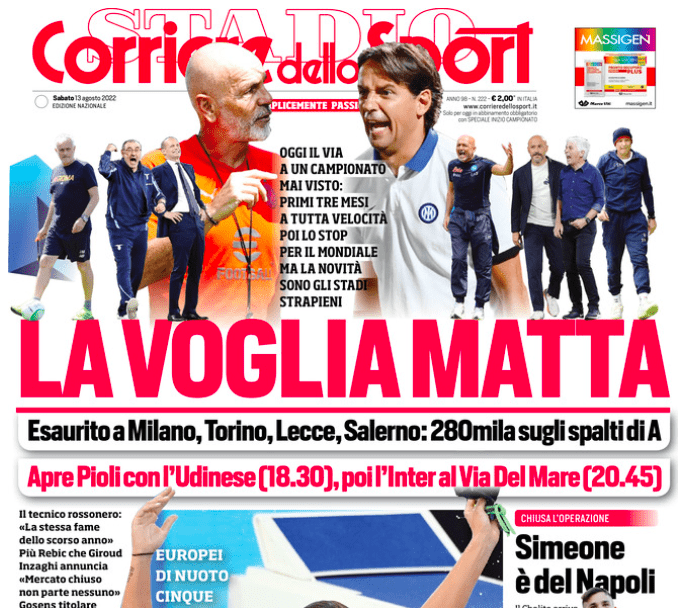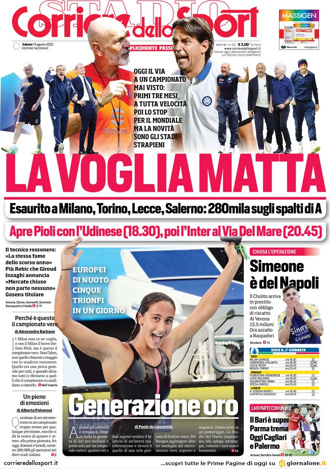 SECOLO XIX – Il Decimonono, oltre parlare della “voglia di rilancio dopo due KO” da parte del Venezia, che ha ritrovato tutti i tesserati positivi al Covid, dà risalto al via libera della FIGC per l’acquisizione del titolo sportivo del Cortefranca da parte del Genoa Femminile, che accede così al campionato di Serie B Femminile (clicca QUI per conoscere il calendario). Sul fronte mercato, Charpentier e Candela verso Venezia al posto di Aramu, che vestirà rossoblu. Sul fronte mercato, si parla dell’addio ufficiale di Favilli, andato alla Ternana, e delle molte offerte ricevute per Kallon e per Masini, due giocatori dei quali il Genoa non vorrebbe privarsi a titolo definitivo. Trovano qui spazio anche le parole di Nikola Ladan, ex calciatore svedese che lavorerà come osservatore del Genoa per quanto riguarda il mercato scandinavo. “L’incarico prevede di monitorare tutto il mercato scandinavo, sono molto orgoglioso di lavorare con il Genoa, società storica e molto ambiziosa. Nel Nord Europa il livello del calcio è cresciuto molto e si trovano giocatori di livello“. Infine, diversi gli approfondimenti legati al campionato di Serie B cominciato ieri col pareggio tra Parma e Bari. “Un campionato da dare i numeri” è il titolo che accompagna “Fuoriserie B“: il minimo comune denominatore resta la constatazione che quello comunicato al Tardini sia uno dei campionati cadetti più difficili ed equilibrati degli ultimi anni.
