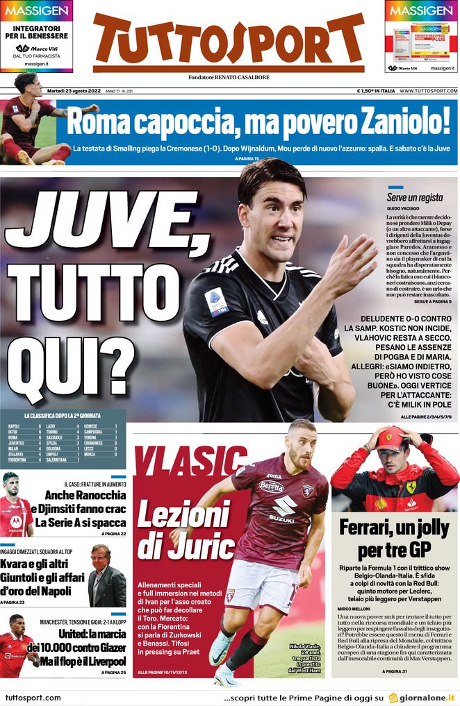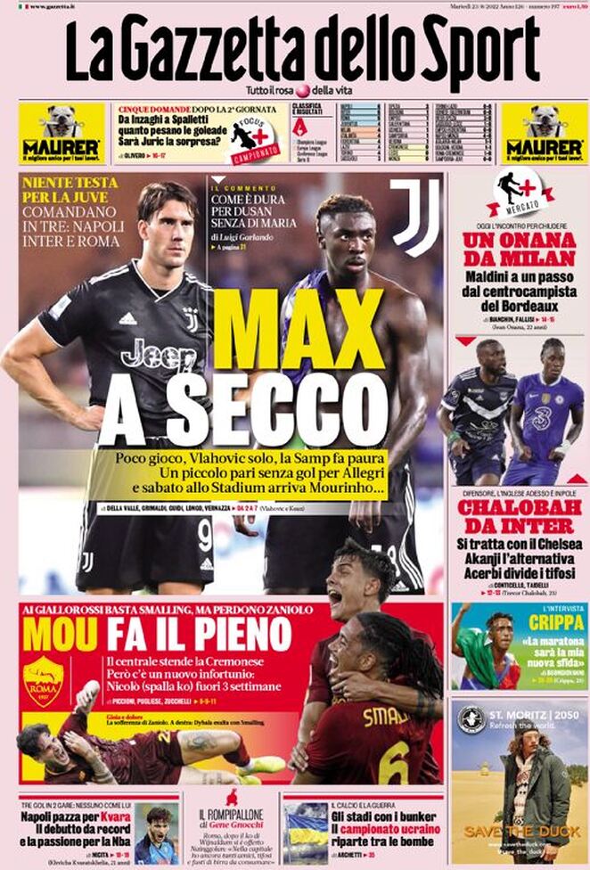 CORRIERE DELLO SPORT – Si parla soprattutto di Serie B e del fatto che le prime venti partite hanno visto sfiorare le 200mila presenze sugli spalti, pochissime centinaia in meno del campionato 2006/2007 che vide ai nastri di partenza non soltanto il Genoa, ma anche Napoli e Juventus. Sul fronte mercato, in attesa di Aramu che arriverà oggi e svolgerà domani le visite, si parla di trattativa ormai definita per Kallon all’Hellas Verona.