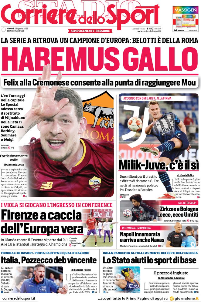 CORRIERE DELLO SPORT – Il Corriere dello Sport parla questa mattina del mercato della Serie B e dà risalto fin dal titolo al ritorno di Strootman al Genoa. In uscita, invece, Calò verso il Cosenza e Kallon pronto ad essere ufficializzato all’Hellas Verona.