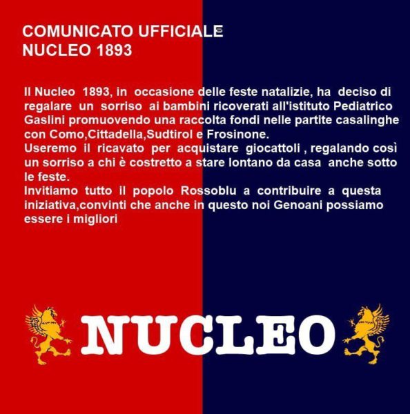 Ecco, di seguito, il comunicato ufficiale: “Il Nucleo 1893, in occasione delle feste natalizie, ha deciso di regalare un sorriso ai bambini ricoverati all’istituto Pediatrico Gaslini promuovendo una raccolta fondi nelle partite casalinghe con Como, Cittadella, Sudtirol e Frosinone. Useremo il ricavato per acquistare giocattoli, regalando così un sorriso a chi è costretto a stare lontano da casa anche sotto le feste. Invitiamo tutto il popolo Rossoblù a contribuire a questa iniziativa, convinti che anche in questo noi Genoani possiamo essere i migliori“.