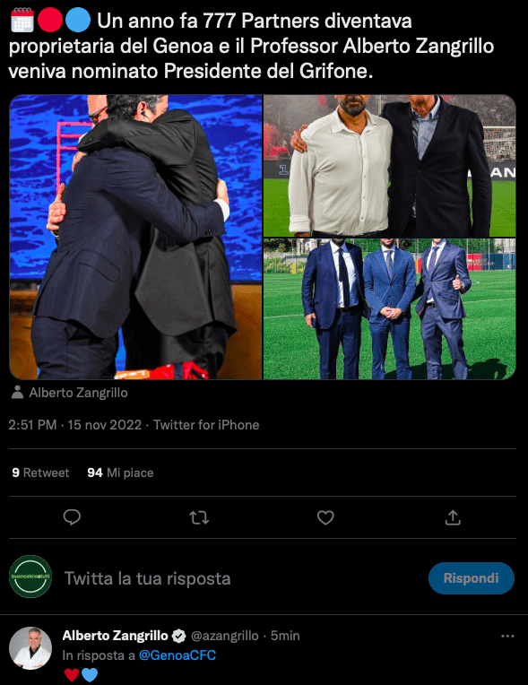 Oltre al primo scatto con l’abbraccio di Josh Wander allo stesso Zangrillo a Palazzo Ducale (era il 22 novembre 2021 e si teneva la conferenza stampa ufficiale, esattamente una settimana dopo la data ufficiale del closing), i social rossoblu rilanciano una seconda fotografia con l’AD Blazquez e una terza con lo stesso Andreas Blazquez e Juan Arciniegas, tra i membri di 777 Partners. Il primo commento, con due cuori, uno rosso e uno blu, è stato proprio del Presidente Zangrillo, come si evince dalle immagini qui sotto.