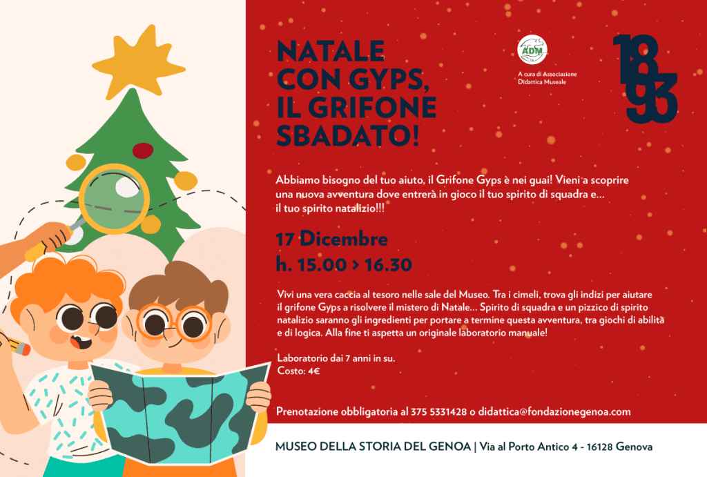 “Natale con Gyps, il Grifone sbadato!” è il prossimo laboratorio del Museo del Genoa a cura di Associazione Didattica Museale che si terrà sabato 17 dicembre, dalle ore 15 alle ore 16.30, a Palazzina San Giobatta. “Abbiamo bisogno del tuo aiuto, il Grifone Gyps è nei guai! Vieni a scoprire una nuova avventura dove entrerà in gioco il tuo spirito di squadra e… il tuo spirito natalizio!” recita l’approfondimento diffuso dal sito della Fondazione Genoa.