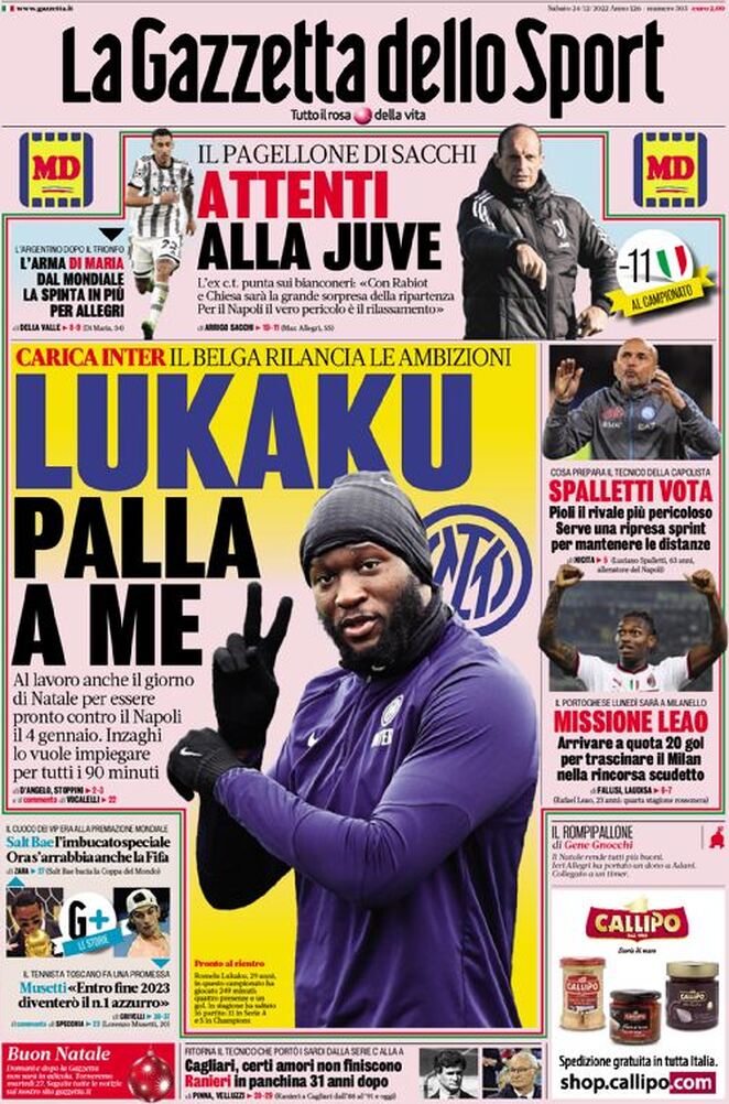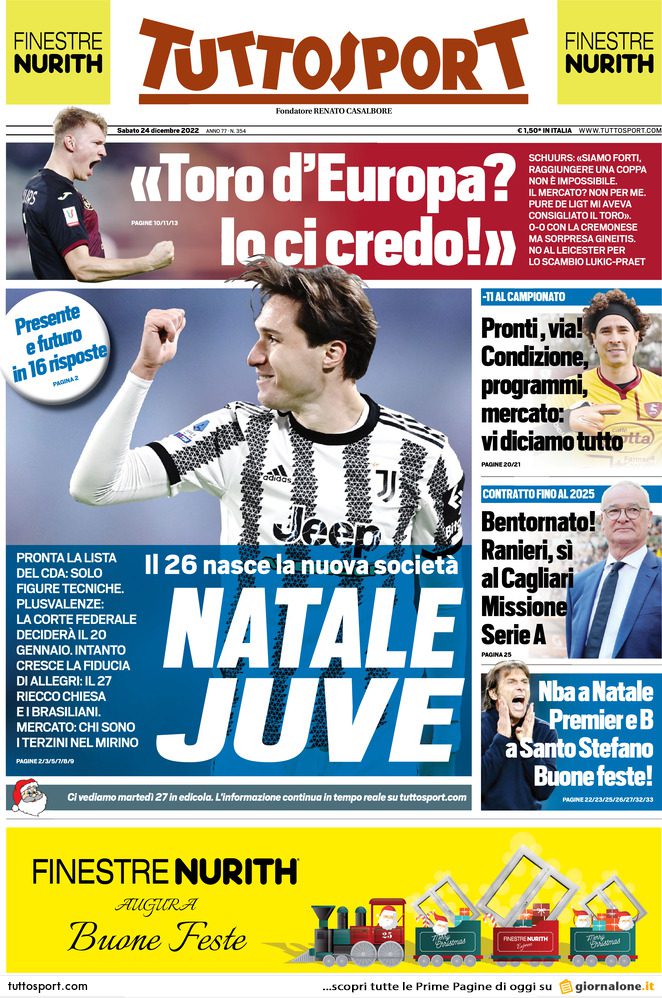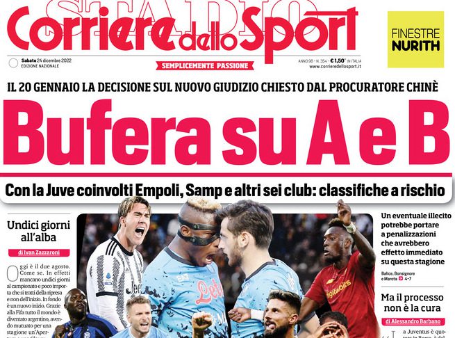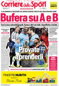 GAZZETTA DELLO SPORT – “La Giustizia sportiva va di corsa: il 20 gennaio già fissato il processo” scrive la Gazzetta dello Sport, che torna sulla richiesta di riapertura per il caso plusvalenze che riguarda la Juventus, e a valanga una lunga serie di altri club di A, B e Lega Pro. Coinvolti anche 52 dirigenti che rischiano l’inibizione. Il punto chiave che viene sottolineato dal quotidiano è che cosa chiederà il capo della procura Chiné, se riconfermerà le richieste di multe e inibizioni già formulate nel primo dibattimento oppure se “alzerà l’asticella sostenendo che le plusvalenze “artefatte”, parole usate dai pm di Torino sono state decisive per l’iscrizione al campionato tirando in ballo la possibilità di penalizzazione di punti e addirittura di retrocessione?“. Per la rosea questa seconda ipotesi appare improbabile. Ma la palla passa al pronunciamento dei giudici del prossimo 20 gennaio. E oltre ad aver parlato di cinque Daspo emessi nei confronti di tifosi del Genoa dopo la trasferta di Terni, in un piccolo trafiletto si parla di Bari-Genoa e del “derby” dell’ex blucerchiato Mignani contro Gilardino in un San Nicola che promette 40mila spettatori.
