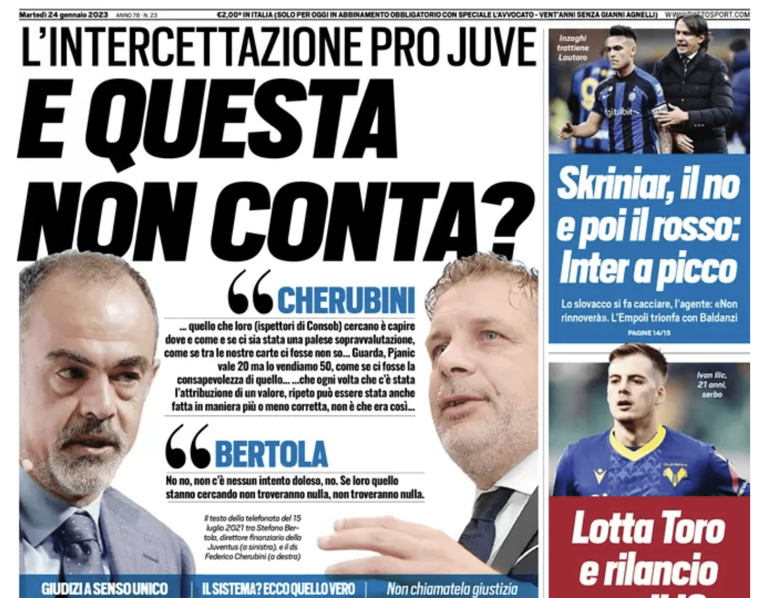 GAZZETTA DELLO SPORT – Più che per questioni di campo, il Genoa fa la sua comparsa in alcune intercettazioni tra Fabio Paratici e un dirigente del Pisa. Il quotidiano in rosa, infatti, parla dell’attesa delle motivazioni della sentenza che ha portato al -15 in classifica per la Juventus e spiega che “quel testo, oggettivamente, condizionerà anche i capitoli successivi di questo inverno “caldo” della giustizia calcistica, in particolare quello sui rapporti di “partnership” del club bianconero “soprattutto” con alcune società e sulla loro “opacità” nei rapporti debito/credito. Un altro rischio per la Juve, ma anche la possibilità di un coinvolgimento di altre società“. Secondo quanto scrive la Gazzetta dello Sport, queste formazioni sarebbero “Sampdoria, Atalanta, Sassuolo, Empoli e Udinese” e l’istruttoria farebbe capo allo “stesso fascicolo della manovra stipendi Juve“. Bene specificare che il Genoa non farebbe parte di questo gruppo di squadre: viene sì menzionato in alcuni virgolettati, ma non figura tra i club che sono sotto osservazione. Il club rossoblu, come noto, è uscito prosciolto lo scorso 20 gennaio dal pronunciamento della Corte D’Appello FIGC chiamata a valutare una possibile riapertura del caso plusvalenze.