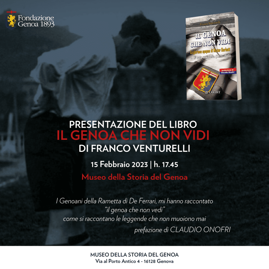 Mercoledì 15 febbraio alle ore 17.45, presso la Sala 1893 del Museo del Genoa, Franco Venturelli presenta il suo nuovo libro dal titolo “Il Genoa che non vidi“. Il testo è il primo di tre volumi e tratta i campionati che vanno dal 1912 al 1915, quando il campionato venne sospeso per lo scoppio della Grande Guerra.