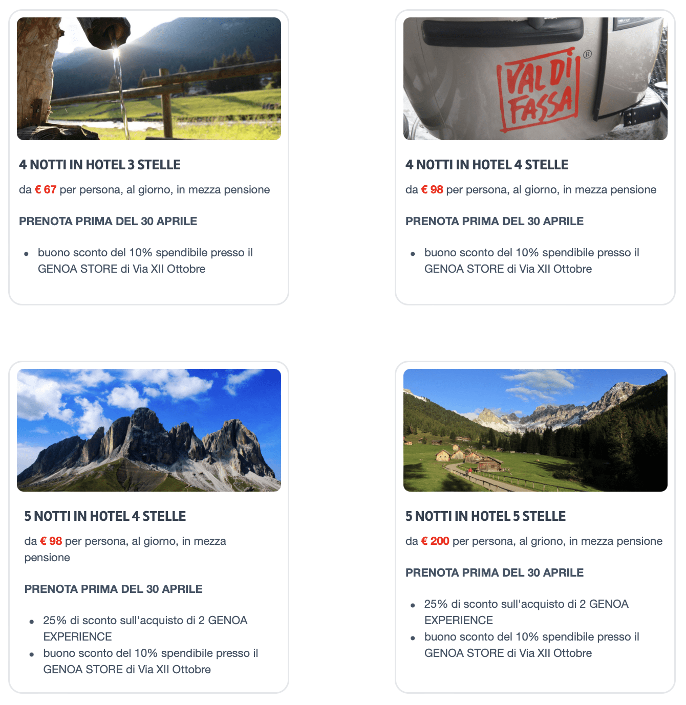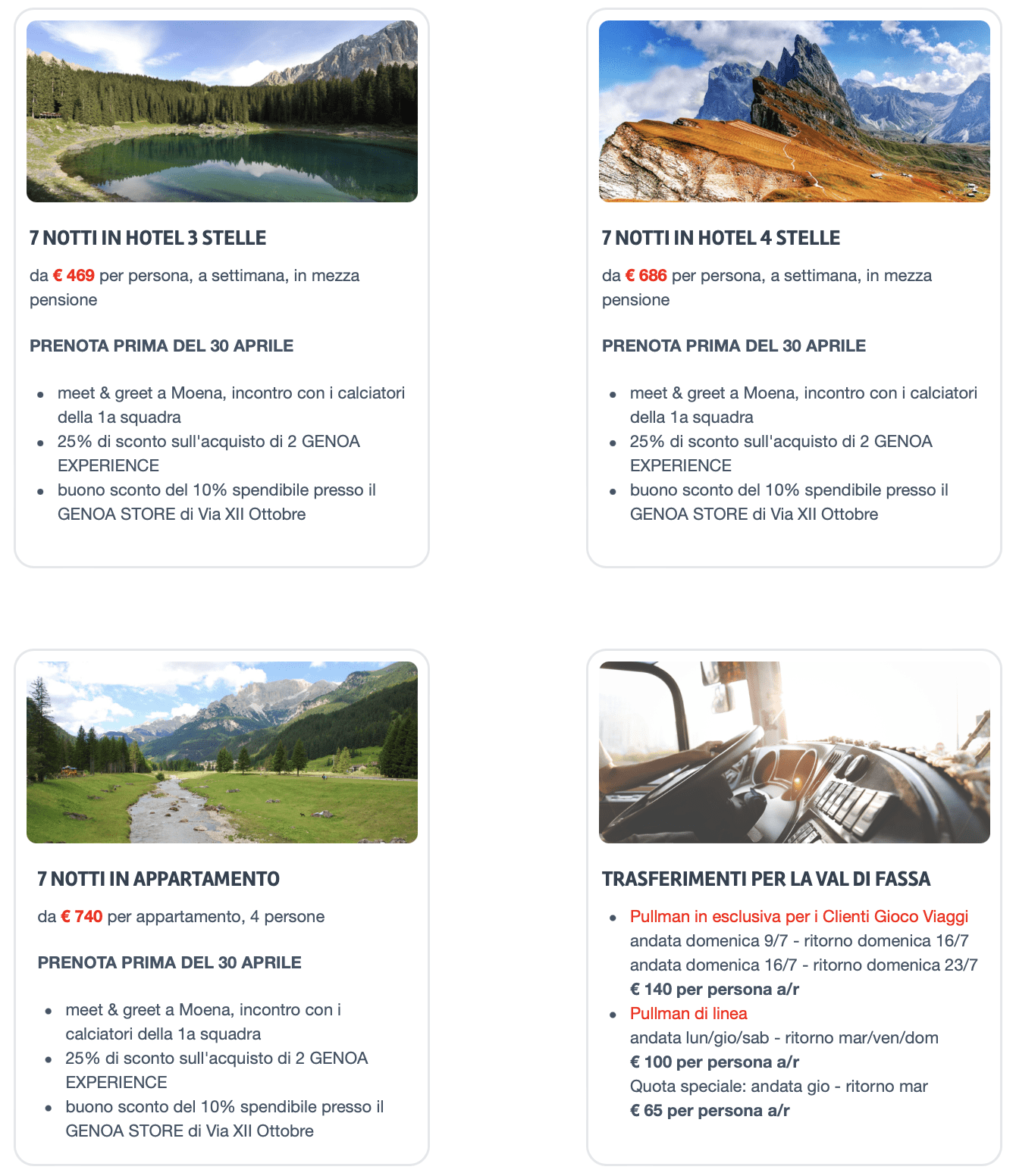 Il Genoa, come annunciato ufficialmente una settimana fa, vivrà la sua fase di ritiro estivo in preparazione alla stagione 2023/2024 in Val Di Fassa, a Moena, dal 10 al 25 luglio. Per prenotare il proprio soggiorno in Trentino Alto-Adige al fianco dei colori rossoblu è possibile passare dall’agenzia Gioco Viaggi, con sede in Via Corsica. Le prenotazioni, aperte sino alle date del ritiro, prevedono dei plus per chi bloccherà il proprio soggiorno entro il 30 aprile.