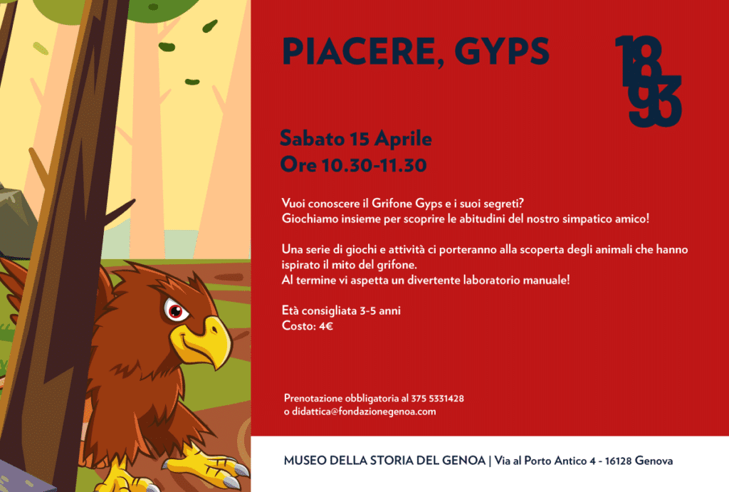 “Vuoi conoscere il Grifone Gyps e i suoi segreti? Giochiamo insieme per scoprire le abitudini del nostro simpatico amico! Una serie di giochi e attività ci porteranno alla scoperta degli animali che hanno ispirato il mito del grifone. Al termine vi aspetta un divertente laboratorio manuale“. L’età consigliata, come si apprende dal sito della Fondazione, è per bambini e bambine dai 3 ai 5 anni. Prenotazione obbligatoria scrivendo all’indirizzo mail didattica@fondazionegenoa.com. Costo di 4 euro.