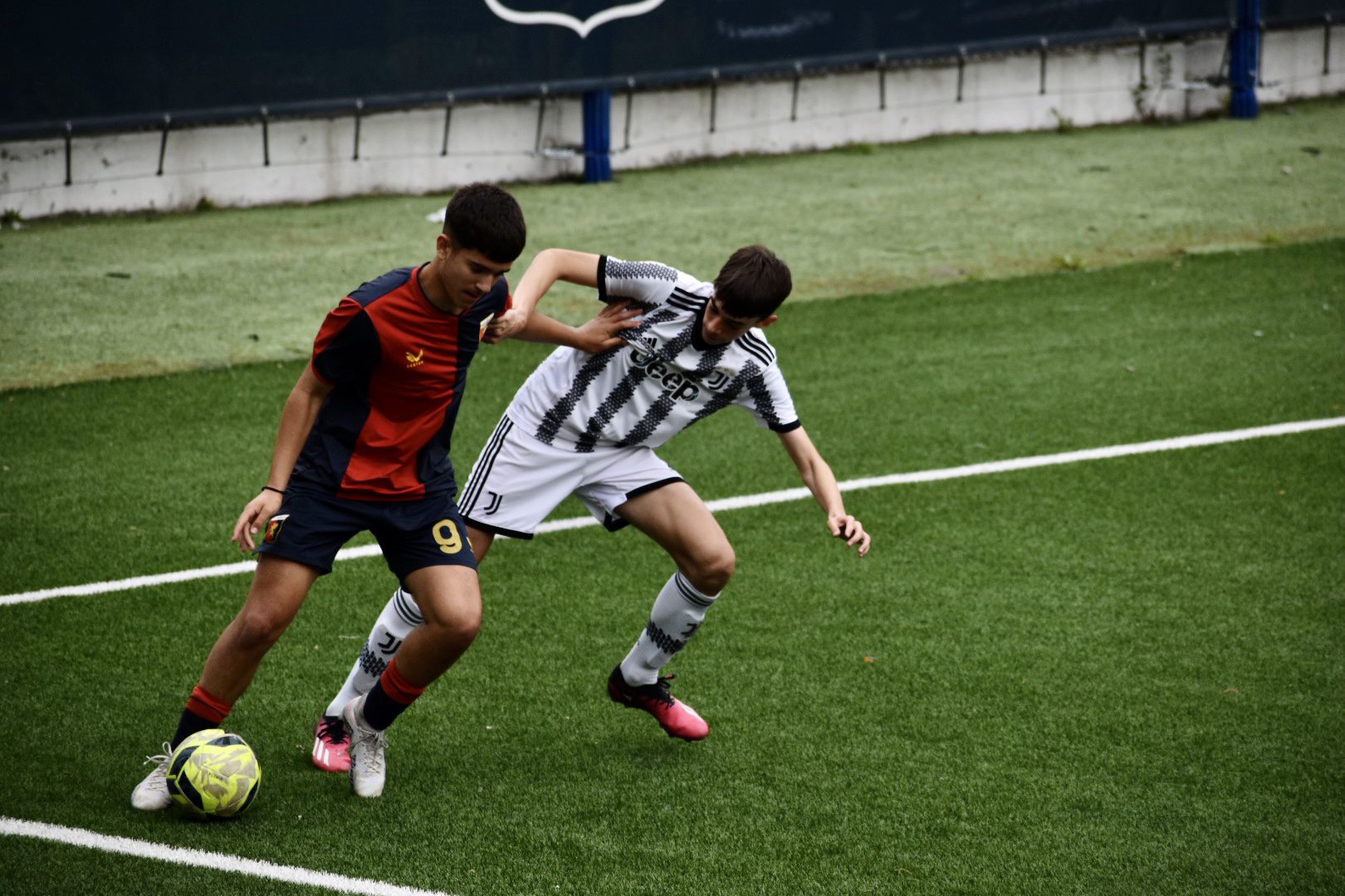 Il Genoa Under 14, di fronte ad una nutrita cornice di pubblico con tanto di fumogeni e striscioni prima del fischio d’inizio, approcciava alla prima partita della Fase Interregionale, che lo vede inserito nel G irone A con Juventus, Milan e Inter. Nell’unica sfida che – inspiegabilmente visto il piazzamento finale al primo posto nella fase a gironi – permetteva ai rossoblu di giocare in casa, i grifoncini classe 2009 faticano ad impensierire la difesa bianconera, complice anche un avvio sprint degli avversari.