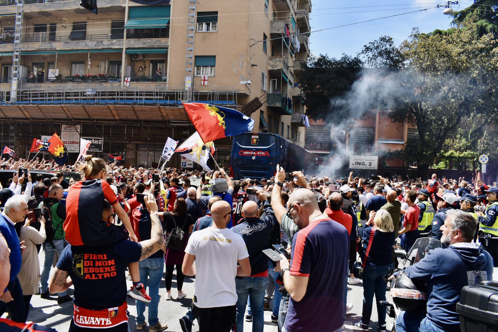 Una lunga attesa quella che sta anticipando il fischio d’inizio di Genoa-Ascoli, sfida molto importante per i rossoblu che ancora rincorrono la matematica della promozione in Serie A. Intorno alle ore 11.30, da Scalinata Montaldo e diretto verso Corso De Stefanis, è partito un corteo dei tifosi rossoblu diretto verso lo stadio Ferraris. Cresciuto nel corso del percorso, ha visto coinvolti almeno 3000 tifosi rossoblu tra bandiere, sciarpe e cori. Tanti anche gli striscioni appesi per tutta la città da balconi e finestre, con Corso De Stefanis che a ridosso dello stadio ha visto crescerne il numero.