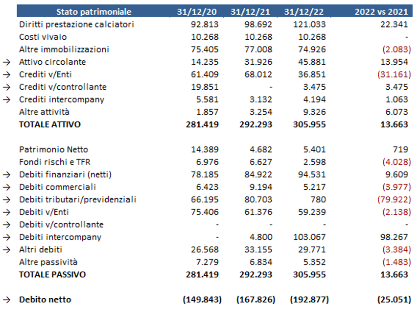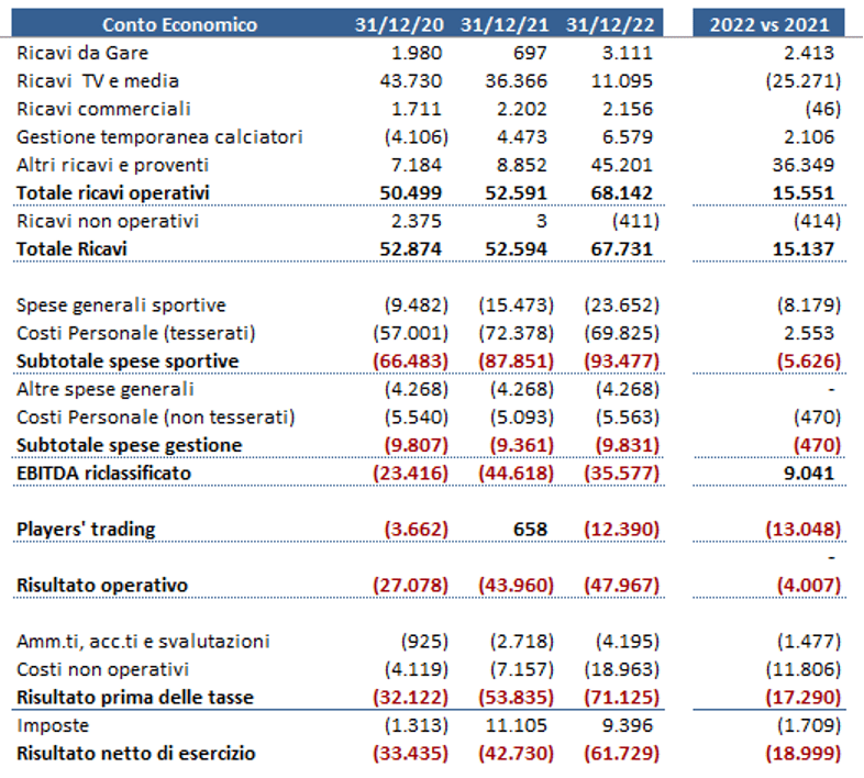 Questa situazione è comune alla maggior parte delle squadre di Serie A e deriva dall’incapacità di contenere i costi del personale entro un livello sostenibile e sarà una delle sfide principali dei nuovi azionisti (il costo del personale tesserato ha rappresentato nel 2022 il 103% dei ricavi, dopo aver raggiunto il 138% nel 2021), unitamente a quella di incrementare i ricavi.