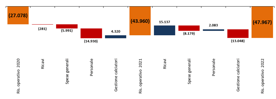 Il grafico consente di apprezzare le voci che hanno portato al progressivo peggioramento del dato fra il 2020 ed il 2022. Purtroppo la gestione del parco calciatori nel 2022, anziché portare un miglioramento ai conti, ha rappresentato una perdita di 12,4 milioni di Euro, in quanto il saldo positivo del calciomercato (10,5 mln) non è stato sufficiente a coprire gli ammortamenti ed i costi degli agenti. Solo per precisione, i costi che hanno dato vita al contenzioso con Preziosi (di cui parleremo dopo) non sono inclusi in questa voce, essendo stati definiti a bilancio come riferiti ad esercizi precedenti.