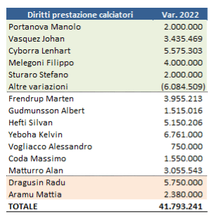 A questo si aggiunga che nel corso del 2022 la Società ha comunque effettuato investimenti significativi sul parco giocatori, come emerge da questa tabella che confronta incrementi e decrementi della voce “Diritti prestazione calciatori”.