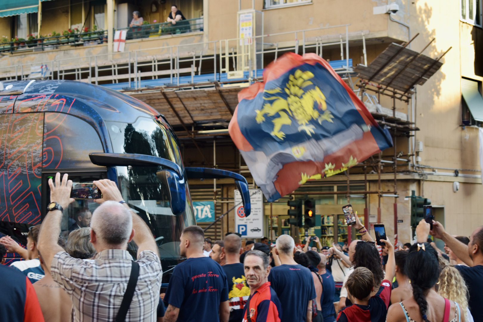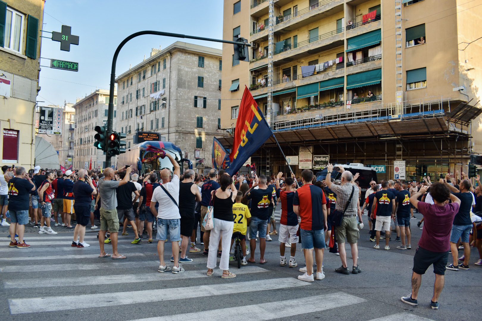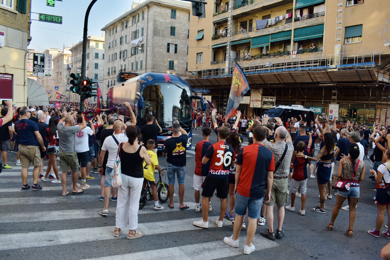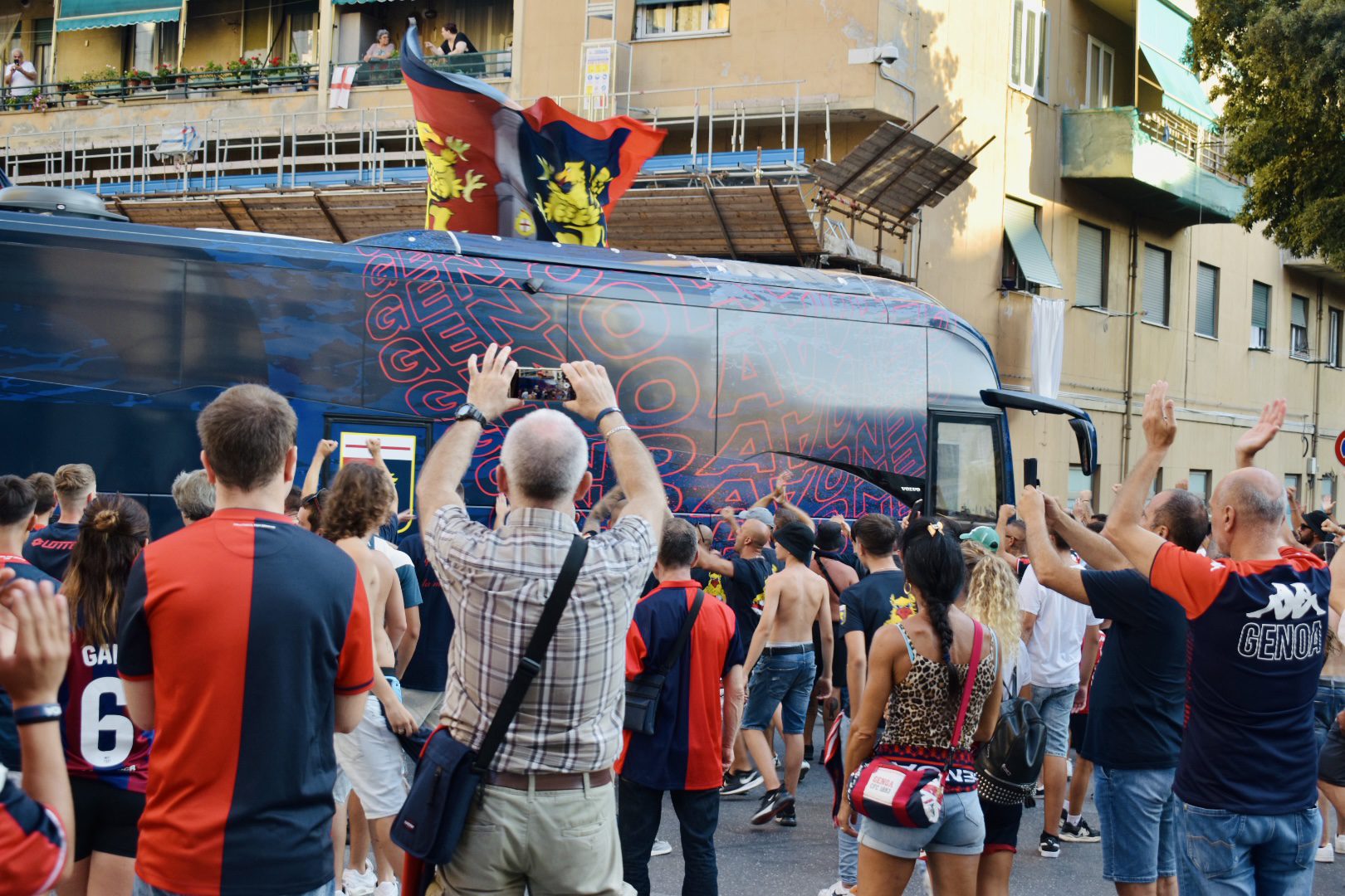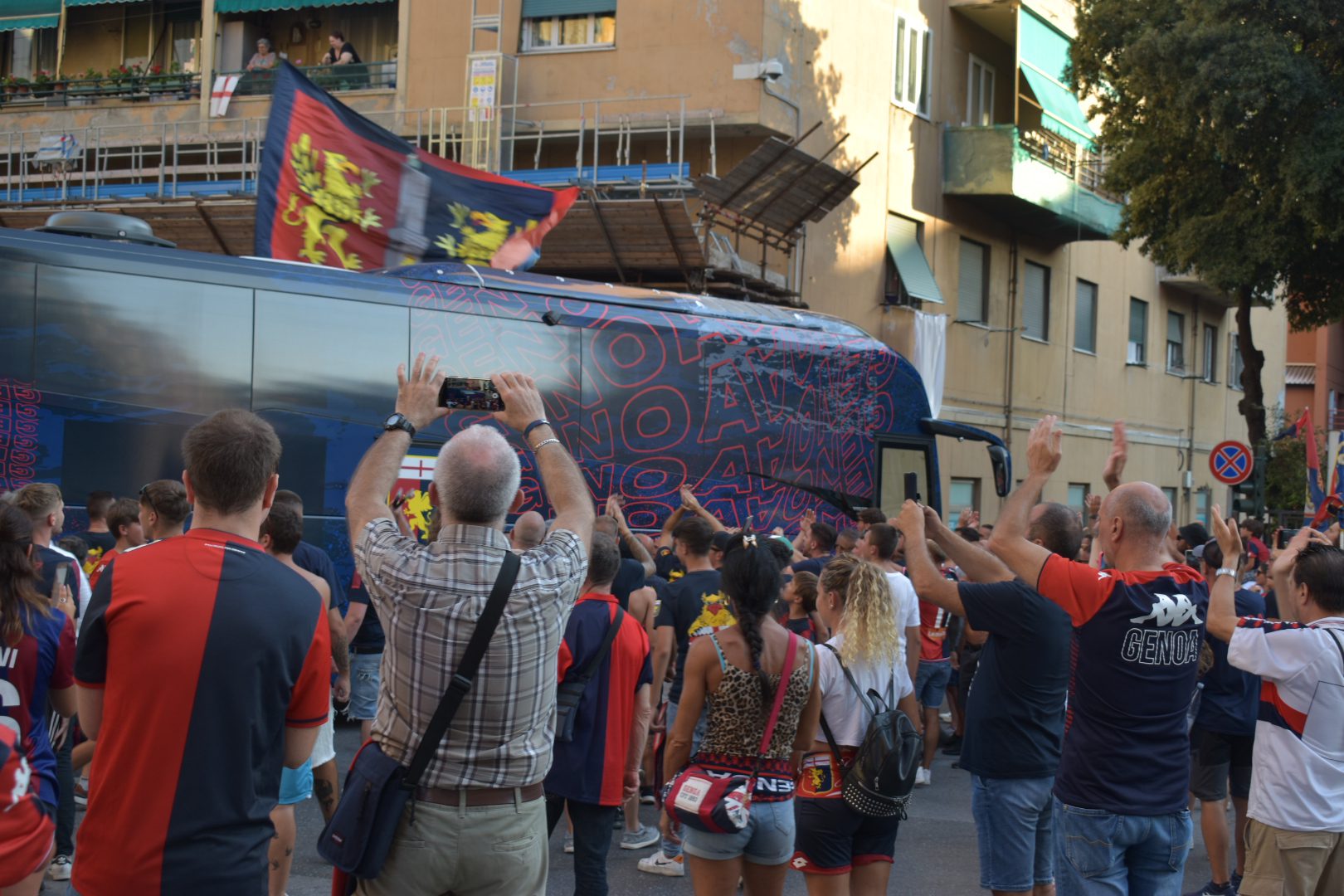 Prima dell’inizio della partita, come annunciato da un comunicato della tifoseria organizzata, i supporter del Genoa si sono radunati fuori dallo stadio Ferraris, in Corso De Stefanis, ad attendere il pullman della squadra, la Freccia Rossoblu, per scortarla verso lo stadio tra bandiere, cori, fumogeni e tanto rossoblu. Una sorta di remake di quanto vissuto prima di Genoa-Ascoli, gara coincisa con la promozione in Serie A. Presenti almeno 5000 tifosi alle spalle dello striscione “Dove eravamo rimasti“, con le lettere A evidenziate in rosso.
