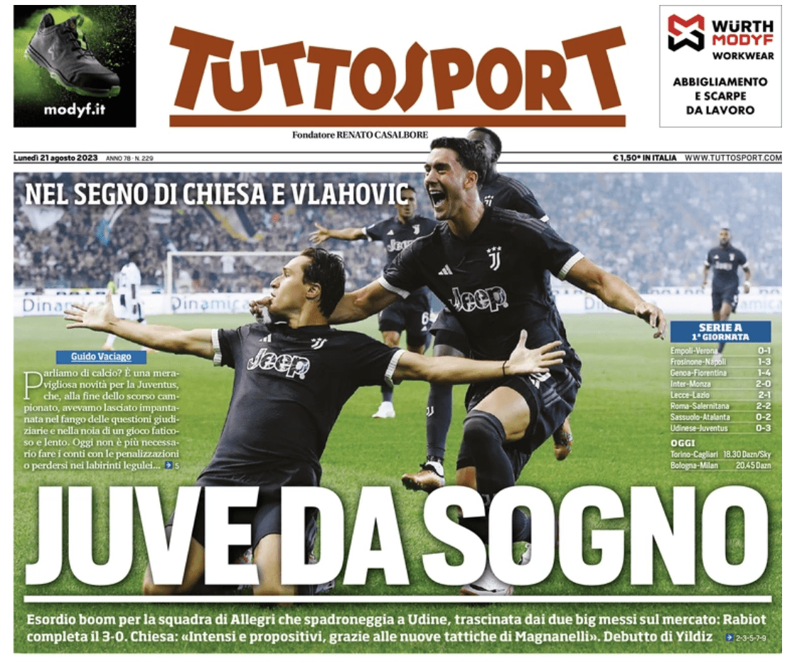 GAZZETTA DELLO SPORT – Il quotidiano in rosa, dal canto suo, parla di un ritorno di fiamma del Genoa per Diego Demme, centrocampista centrale del Napoli in uscita vista la folta concorrenza, che si accrescerà ulteriormente con l’arrivo di Diego Veiga dal Celta Vigo. C’è anche un secondo approfondimento su alcune delle squadre uscite sconfitte dalla prima giornata di Serie A, dal Monza al Frosinone, dall’Empoli al Genoa. Ci si domanda che cosa manchi dal mercato (e non solo) per abbassare lo stato di allerta in una stagione che si preannuncerà difficile.