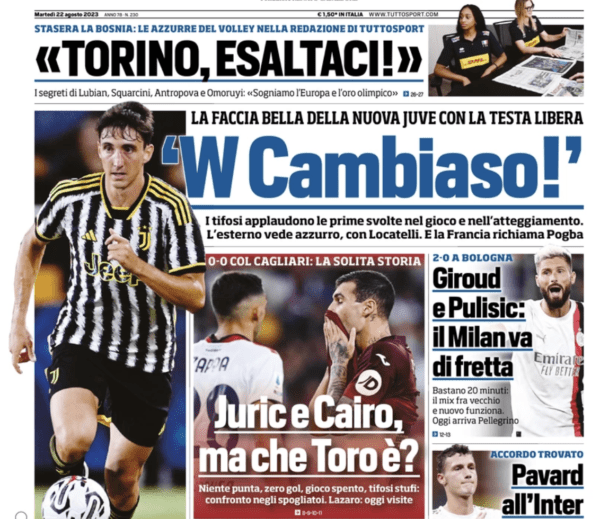 “In difesa Kjaer o Pezzella, a destra rispunta Lirola“, anche se – pur avendo perso la pazienza da giugno scorso – il Genoa non esclude un ritorno di fiamma nelle ultime ore di mercato per Zanoli, che spinge per andare a giocare e che ha lo stesso agente di Gilardino e lo stesso intermediario dell’operazione Retegui, ossia Alessandro Moggi. Tante le opzioni in uscita: Puscas gradito in Turchia; Aramu, Coda e Puscas seguiti dal Bari; Besaggio è vicino all’Ascoli. Infine, chiudono die approfondimenti: il primo sull’esordio da allenatore di Criscito con l’Under 14 del Genoa, il secondo sui molti tifosi rossoblu che, malgrado prezzi altissimi dei biglietti, stanno preparando l’esodo verso Roma.