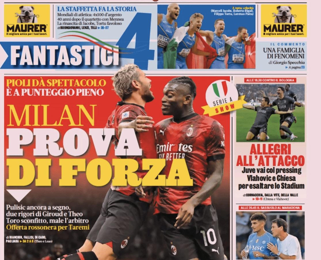 GAZZETTA DELLO SPORT – “Immobile-Retegui, arbitra Spalletti. Tra Lazio e Genoa è sfida nazionale” titola la Gazzetta dello Sport, che come ieri parla della sfida dell’Olimpico anche in chiave Nazionale italiana di calcio. In campo, infatti, andranno i due centravanti della formazione azzurra. Sponda Torino, prossimo avversario del Genoa e ieri sera sconfitto per 4-1 in casa del Milan, si leggono le parole di Ricci. “Riscattiamoci subito col Genoa“.