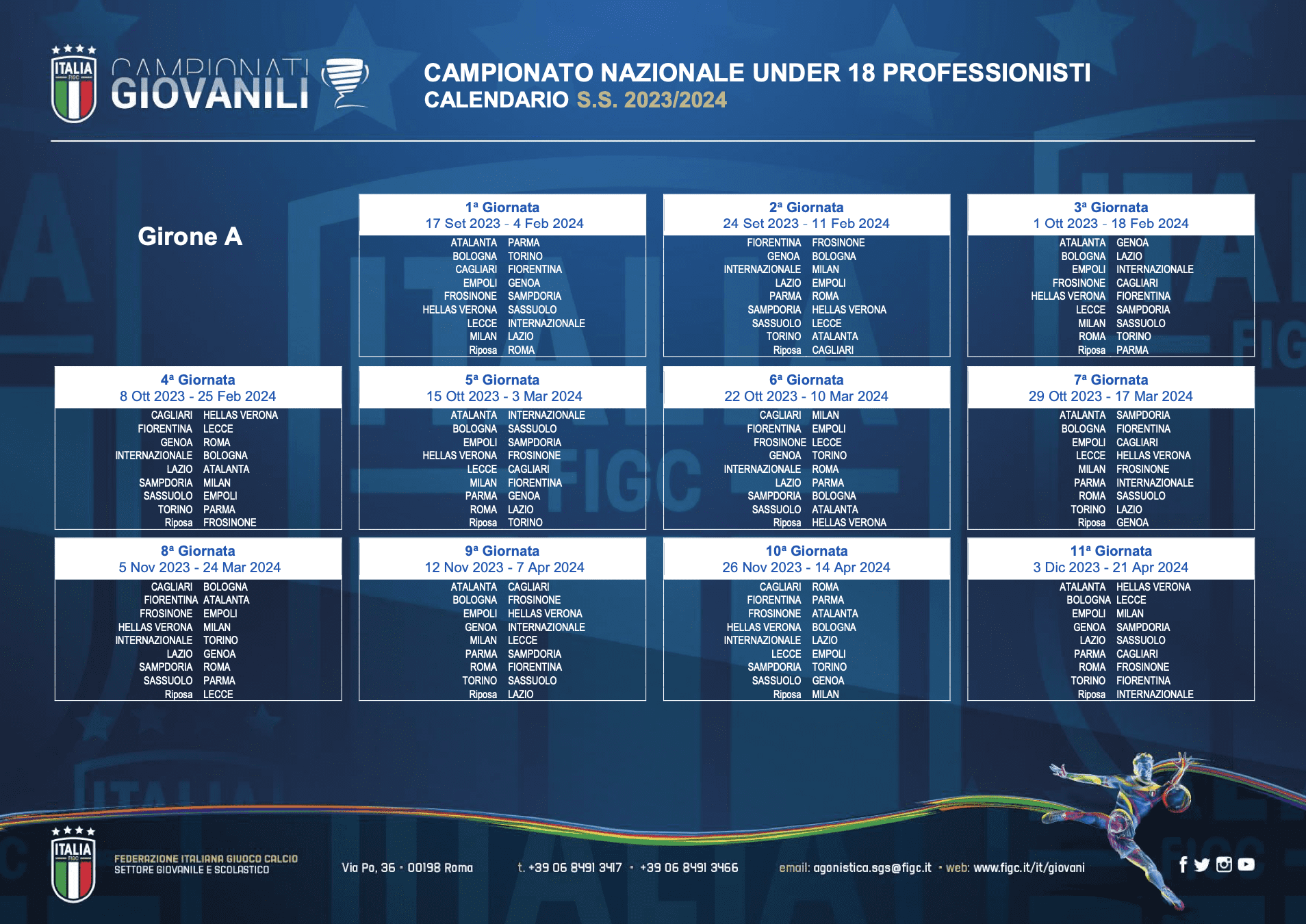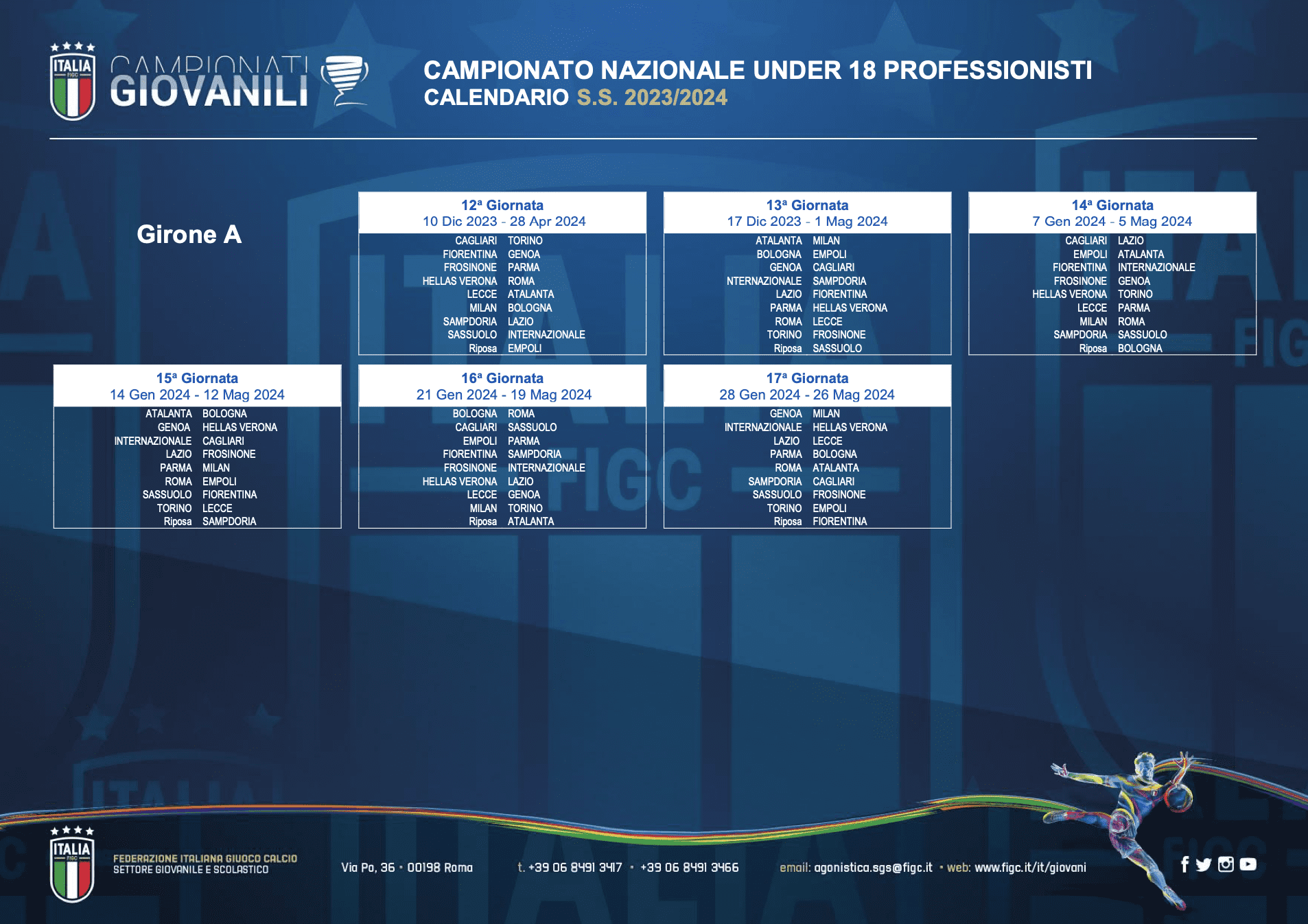 Sono stati diramati i calendari ufficiali della prossima stagione sportiva del Genoa Under 18 allenato da mister Ruotolo. Di seguito i gironi di andata e ritorno della formazione rossoblu dove giocheranno i calciatori classe 2006. Si partirà il 17 settembre con la trasferta di Empoli, poi la prima gara casalinga sarà contro il Bologna. Due turni di riposo: il primo il 29 ottobre 2023 e il secondo il 17 marzo 2024.