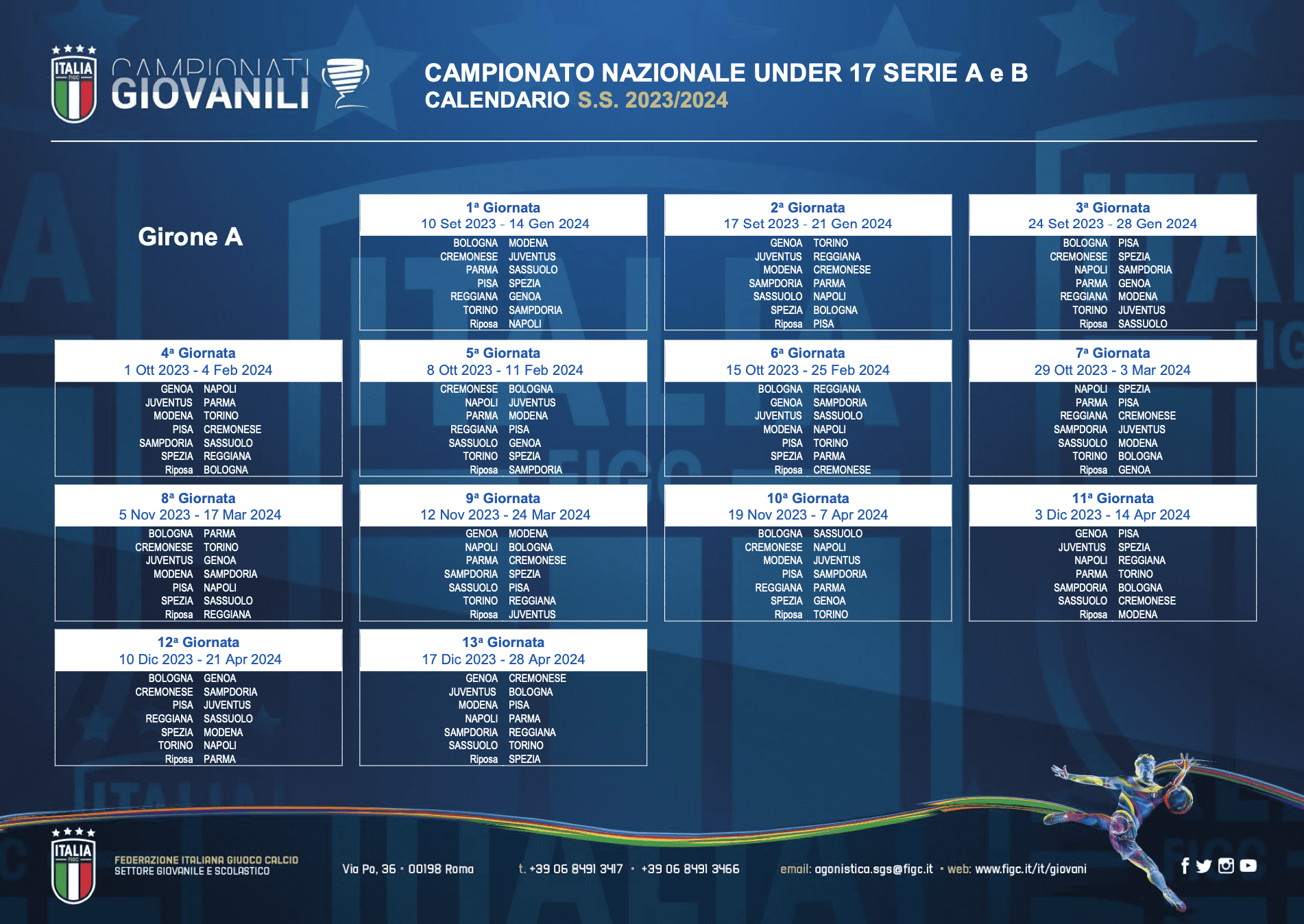 Sono stati diramati i calendari ufficiali della prossima stagione sportiva del Genoa Under 17 allenato da mister Chiappino. Di seguito i gironi di andata e ritorno della formazione rossoblu dove giocheranno i calciatori classe 2007. Si comincerà il 10 settembre 2023 e si terminerà il 24 aprile 2024. Due i turni di riposo per il Genoa, previsti il 29 ottobre 2023 e il 3 marzo 2024.