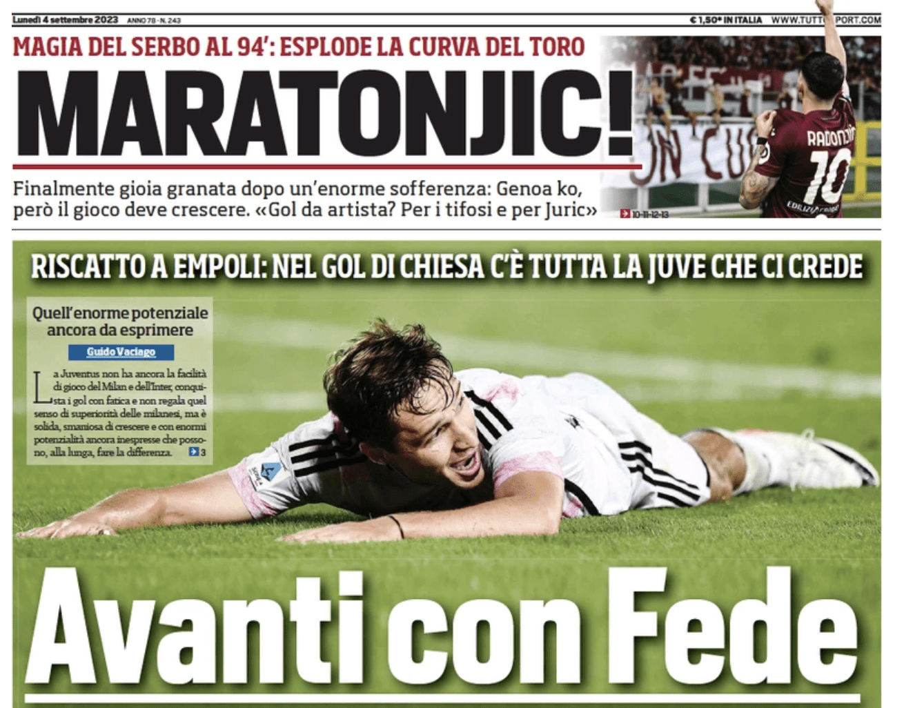 TUTTOSPORT – Chiude Tuttosport che già dalla prima pagina, col titolo “Maratonjic!“, apre una lunga serie di approfondimenti legati al successo del Torino in extremis sul Genoa. “Finalmente gioia granata dopo un’enorme sofferenza: Genoa KO, però il gioco deve crescere. “Gol da artista? Per i tifosi e per Juric” è il sottotitolo dell’articolo, che analizza dal primo all’ultimo minuto la gara di ieri pomeriggio. Spazio anche per le parole di mister Gilardino, in un mix tra quanto dichiarato a DAZN e quanto dichiarato in conferenza stampa. “Beffati: però se non segniamo…” è il virgolettato attribuito al tecnico rossoblu che fa capolino su Tuttosport.
