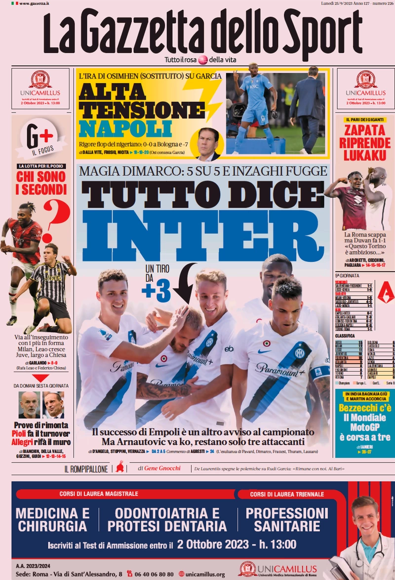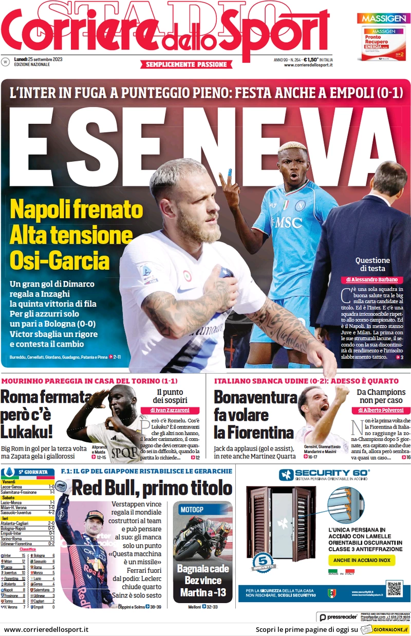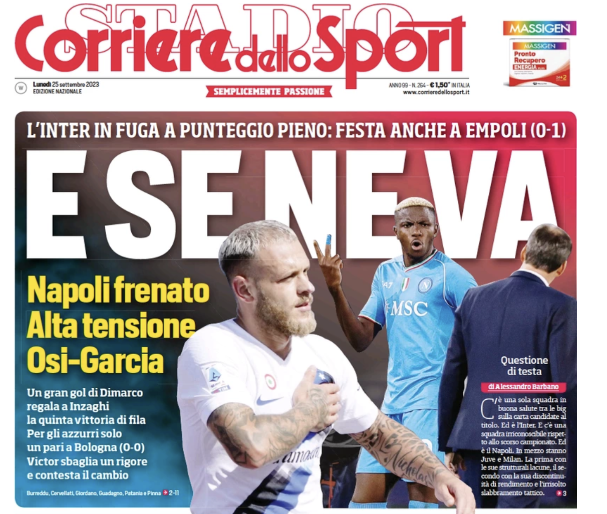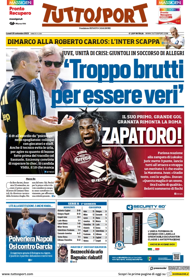 REPUBBLICA – “Le metamorfosi del Genoa. Resta incerto il vero valore” è il titolo dell’edizione genovese di Repubblica che apre la settimana che porterà, giovedì 28 settembre, alla sfida contro la Roma. “Sinora il campionato dei rossoblù è stato costellato da alti e bassi – scrive il quotidiano – Gilardino, che si augura di recuperare al più presto Messias e Vogliacco, spera contro la Roma di trovare la versione migliore”. Viene evidenziato come contro il Napoli, nell’ultima gara casalinga, i rossoblu si siano mostrati particolarmente “aggressivi e senza paura” e come occorra ripetere la medesima prova coi giallorossi. Nel frattempo, mister Gilardino e il suo staff attendono di avere tutta la rosa a disposizione.