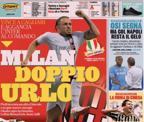 TUTTOSPORT– “Genoa, puoi mandarli in crisi!” è il titolo di Tuttosport, sempre nell’ottica di riprendere quelle che sono state le parole del tecnico Gilardino alla vigilia. Vigilia nella quale non ha parlato, invece, il collega Mourinho. Anche qui, nello schema che ridisegna i possibili assetti tattici, il Genoa viene schierato col 4-3-2-1.